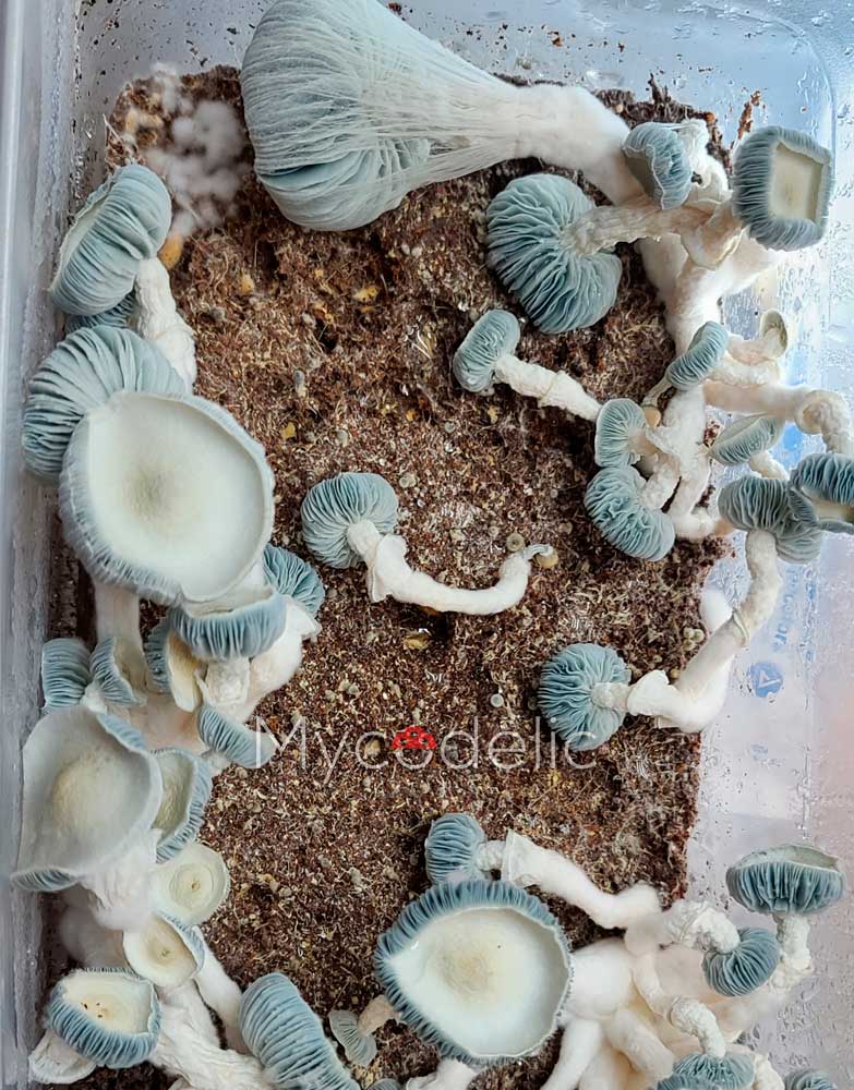 El resultado es una cepa que no solo hereda la potente morfología del linaje Penis Envy, sino también el aspecto albino pálido de las variantes leucísticas, con una coloración azul muy marcada cuando se expone a presión o manipulación. Es, sin duda, una de las cepas más llamativas jamás desarrolladas dentro del mundo de P. cubensis.
